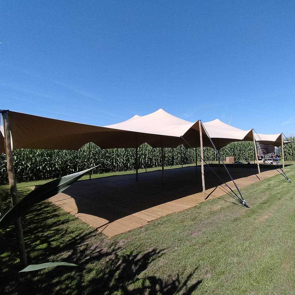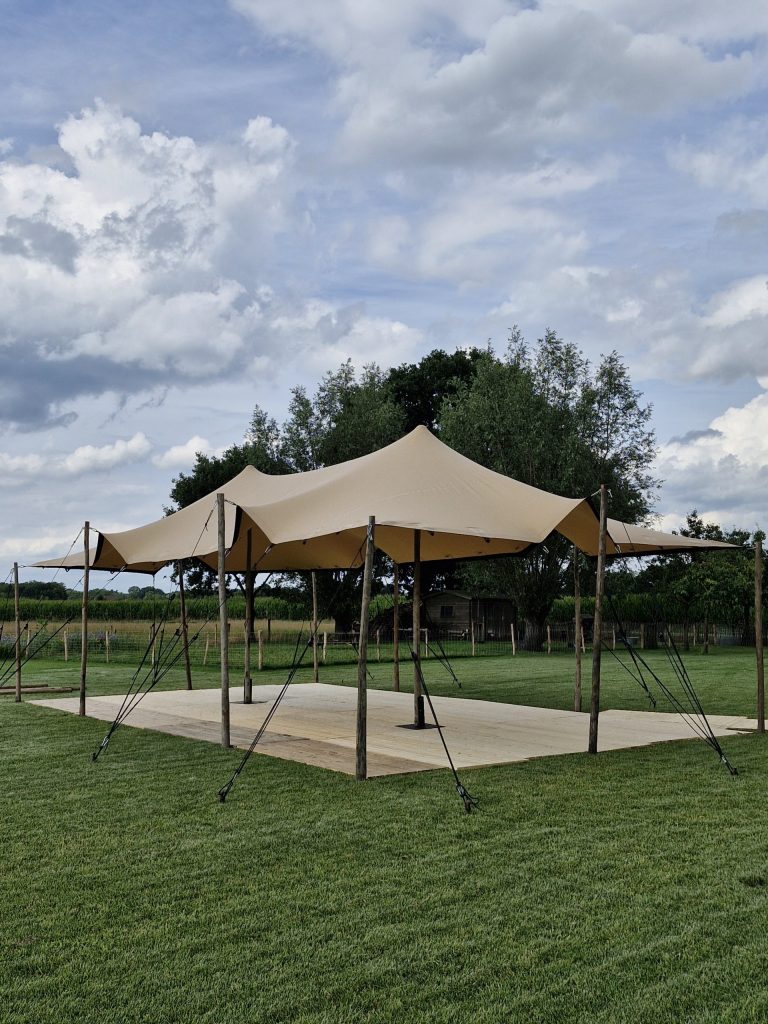 Een stretchtent is geen standaard tent, maar een echte sfeermaker. Door het gebruik van elastisch doek en houten palen ontstaat een speelse en organische vorm die meteen een warme uitstraling geeft aan jouw evenement.