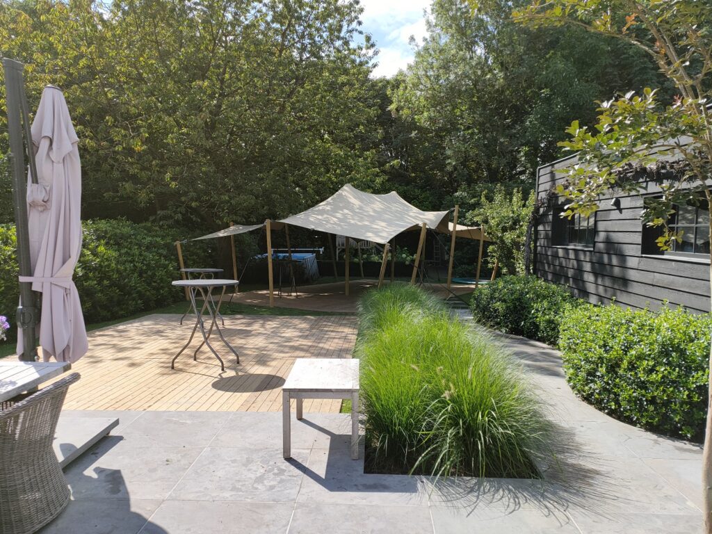 Wat deze tent zo bijzonder maakt, is de flexibiliteit. De tent kan op verschillende manieren opgesteld worden, waardoor ze zich perfect aanpast aan de omgeving. Of je nu werkt met een strakke tuin, een open veld of een festivalsetting, een stretchtent vormt altijd één geheel met de locatie.